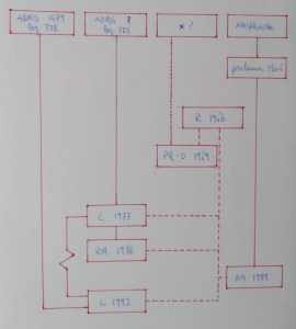 Aunque el circuito parezca cerrado, solo lo estaría si se tuvieran en cuenta las líneas discontinuas. En realidad, se trata de cuatro tradiciones independientes: Prada Rengel-Olivós 1959, que como ha permanecido inédito se agota en sí misma; legajo 723-Collantes 1977, con un apéndice, el de Ramírez Moreno de 1986, que incurre en lecturas tan aconsejadas por su punto de vista que no es necesario tomarlo en consideración; proclama 1864-Arroyo Navarro 1989; y legajo 728-Ladero 1992.