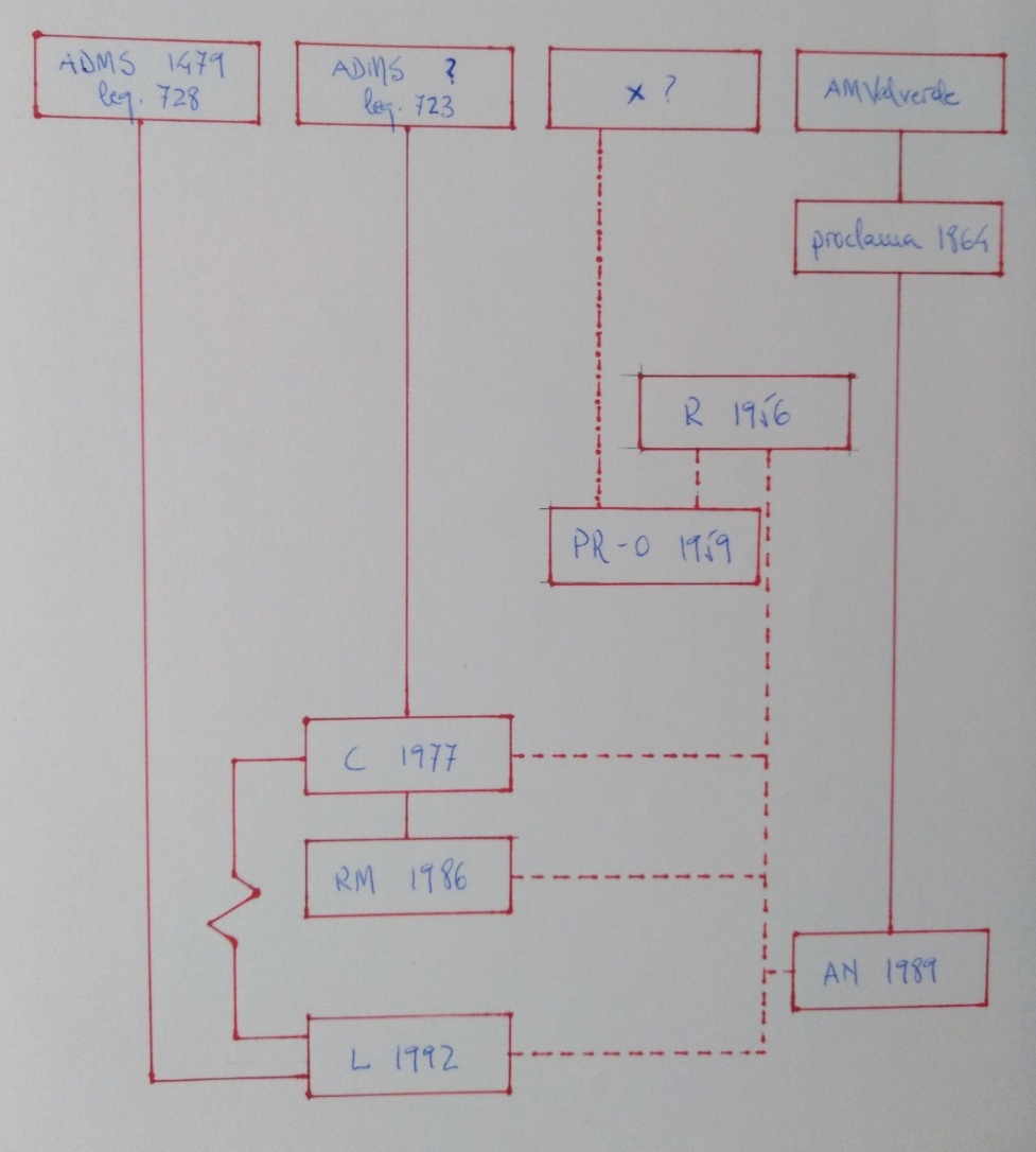 Aunque el circuito parezca cerrado, solo lo estaría si se tuvieran en cuenta las líneas discontinuas. En realidad, se trata de cuatro tradiciones independientes: Prada Rengel-Olivós 1959, que como ha permanecido inédito se agota en sí misma; legajo 723-Collantes 1977, con un apéndice, el de Ramírez Moreno de 1986, que incurre en lecturas tan aconsejadas por su punto de vista que no es necesario tomarlo en consideración; proclama 1864-Arroyo Navarro 1989; y legajo 728-Ladero 1992.